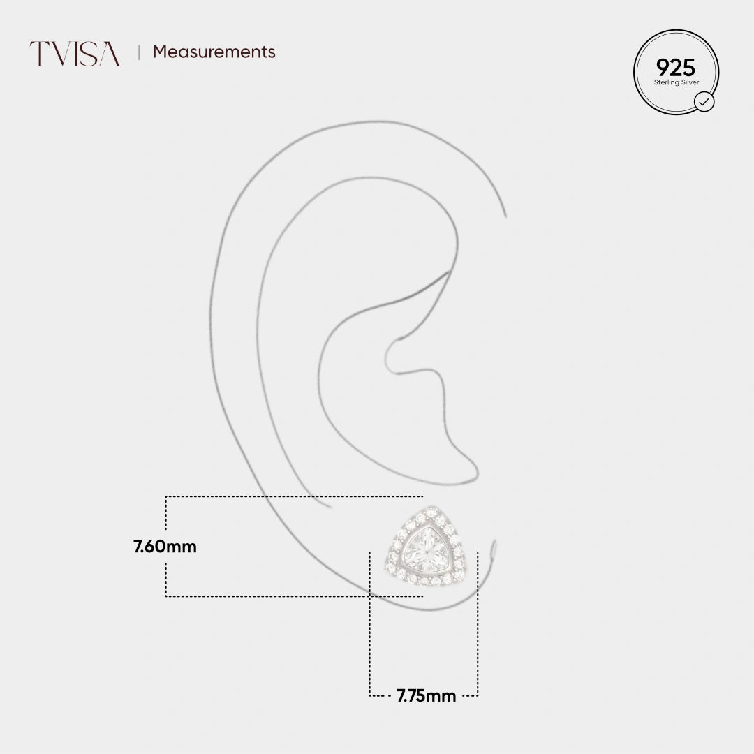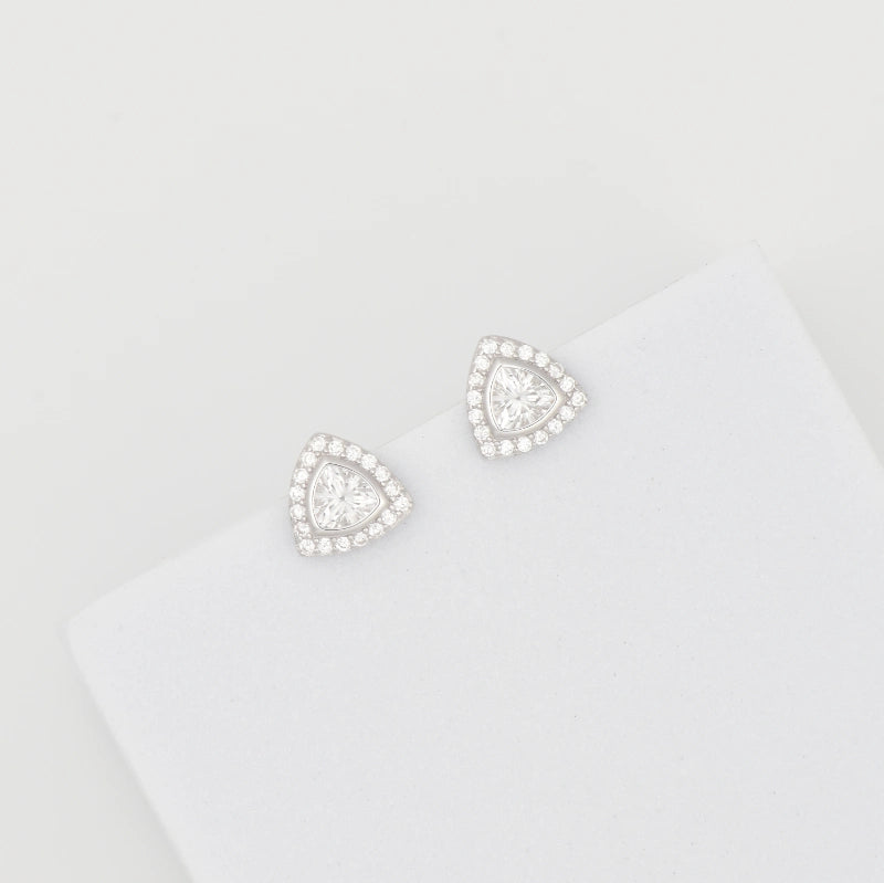 Stand out from the crowd with this modern twist on a timeless classic. The solitaire earring gets an architectural update, showcasing a brilliant triangular diamond solitaire in a gleaming silver setting. But the sparkle doesn't stop there - a sprinkling of smaller accent diamonds surrounds the centerpiece, ensuring you'll catch the light from every angle.