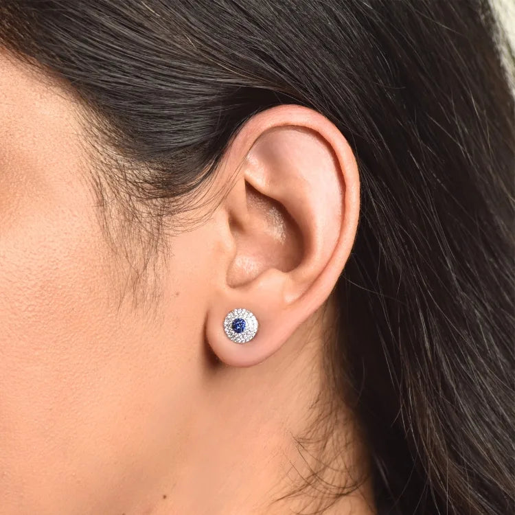 Round diamonds encircle striking blue diamond centerpieces, creating an aura of luxury and glamor. The vibrant blue stones are a rare find, lending these earrings an air of exclusivity that will command attention.